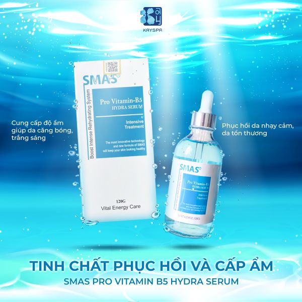 Tinh Chất Phục Hồi Và Cấp Ẩm Smas Pro Vitamin B5 Hydra Serum là dạng tinh chất với công dụng cung cấp độ ẩm và cân bằng độ ẩm cho làn da của bạn đảm bảo duy trì độ đàn hồi cho da. Đồng thời đẩy nhanh các quá trình hồi phục tổn thương trên da do các tác nhân xấu gây nên. Đồng thời, tinh chất này cũng bổ sung cho da nhiều tinh chất tốt nuôi dưỡng da khỏe mạnh và mịn màng.